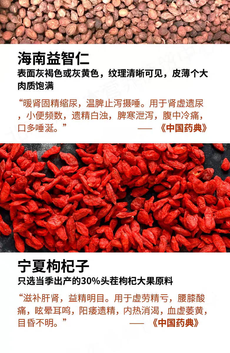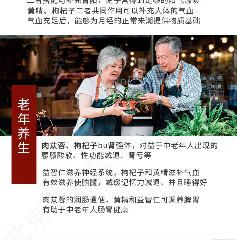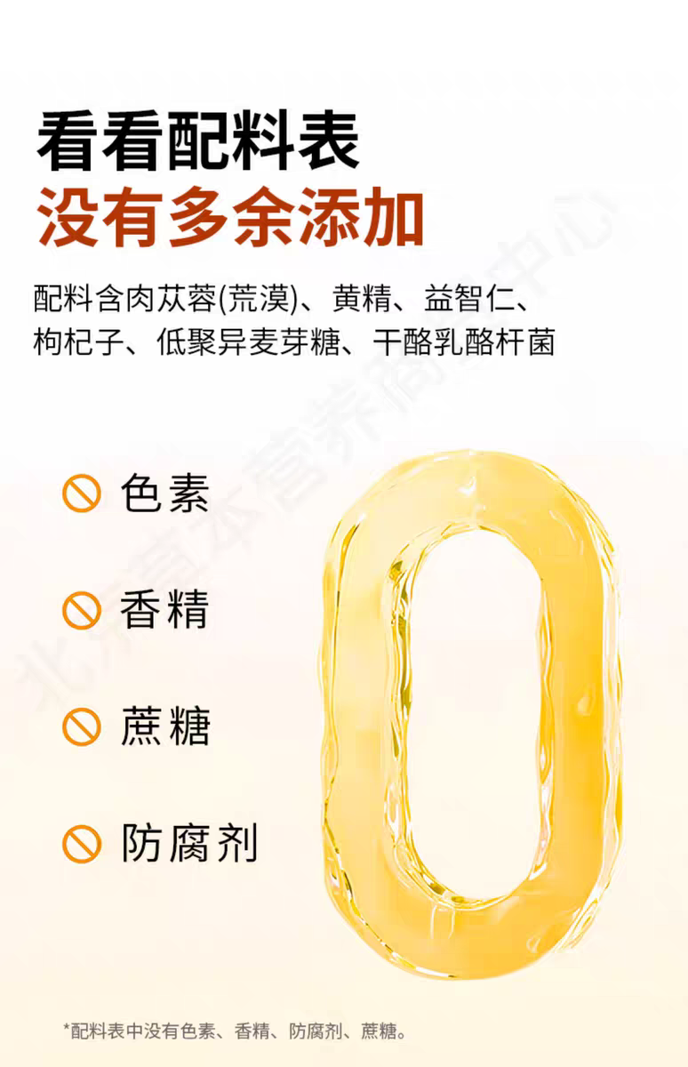 配料:纯净水、肉苁蓉(荒漠)、黄精、益智仁枸杞子、低聚异麦芽糖、干酪乳酪杆菌净含量:7g*9条保质期:24个月
